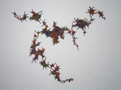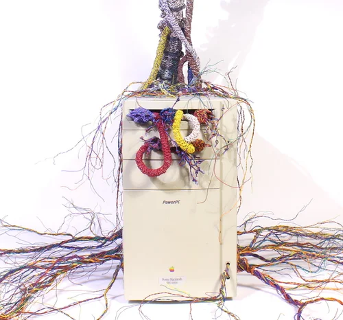 This work is an investigation into the transformation of technological waste into objects of care and contemplation. Through the labour of the hand, discarded cables and obsolete infrastructure are imbued with new life, reconfigured into whimsical yet uneasy hybrids that straddle the boundary between nature and machine.The recognizable mushrooms and flowers, interspersed with abstracted, mutated forms, represent both ecological growth and digital mutation. They disperse like spores of possibility: playful yet unsettling, raising questions about what evolves from the remains of our technological excess.