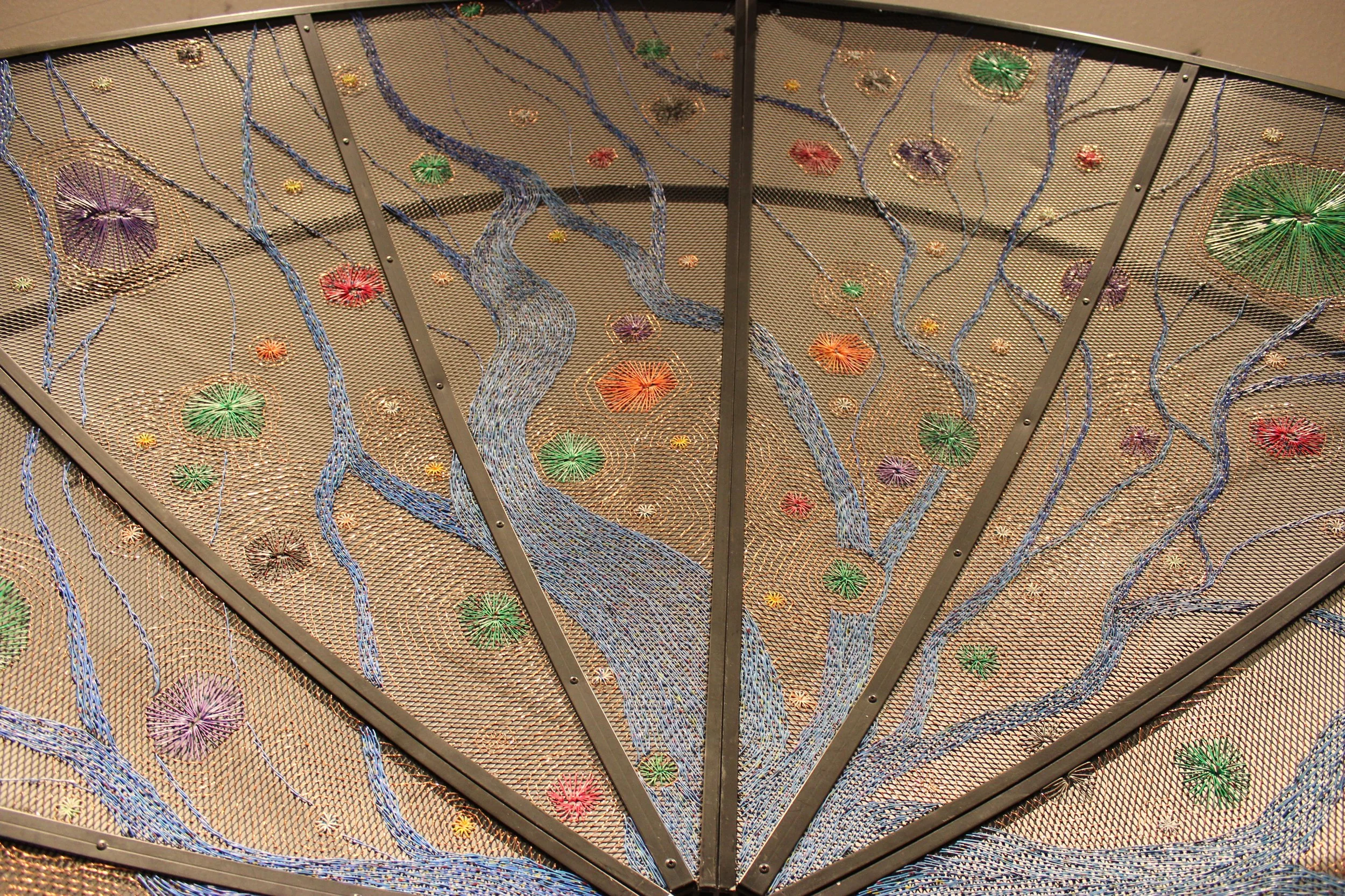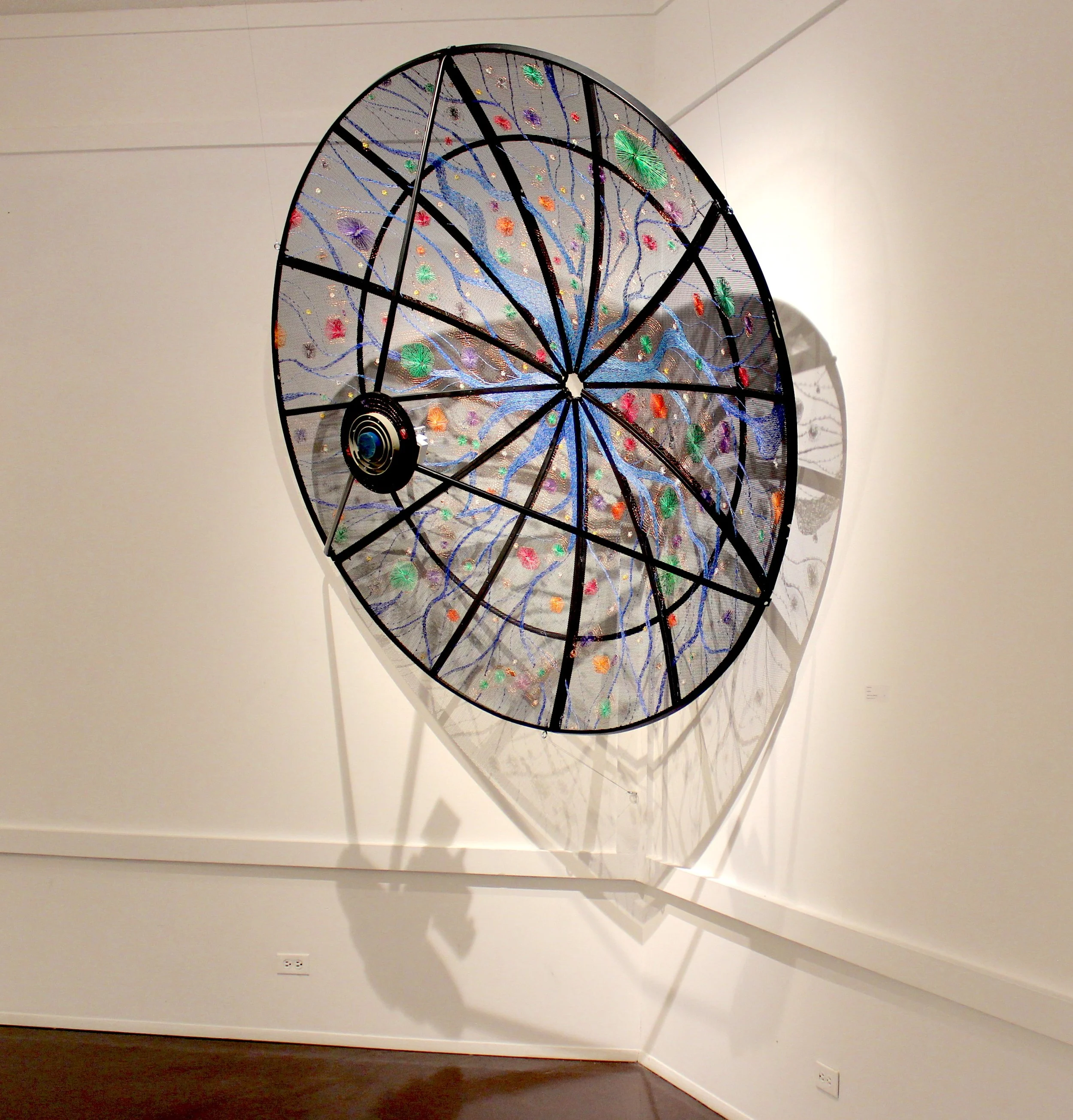 Conversion is a series of embroidered metal satellite dishes. Conversion is so named because the main function of a satellite dish is to convert microwave signals into electric signals that can be used by a computer, tv and other devices. In my rendition, the conversion is from an abandoned technology to an artwork that presents as spectacle and object of consideration engaging the topics of technology, gendered labour, and forms from nature. The embroidered images reference roots, river systems, florals and fungi and are representative of the area I live in Northern British Columbia. These abstracted natural forms are re-interpreted in bright colours using post-consumer telecommunication cables as the embroidery medium. The embroidered images present as a topographical view, playing on the role of an-earth bound satellite dish and its communication to satellites situated in space.
